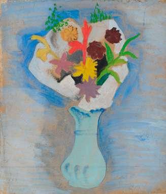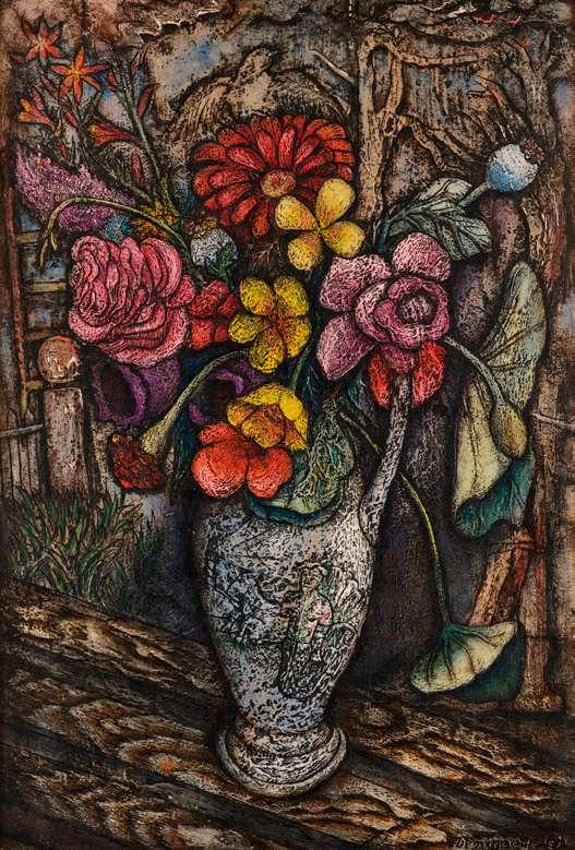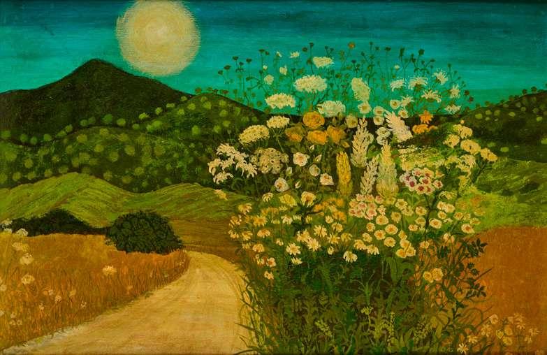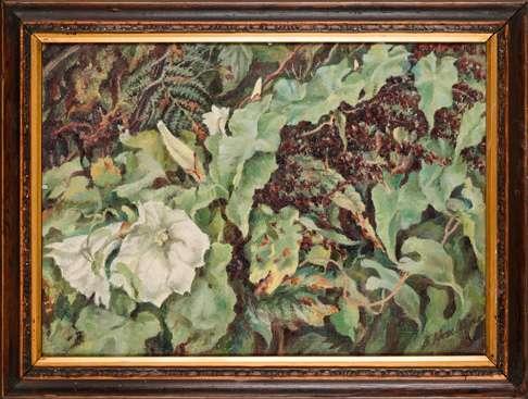 Executed circa 1943-44. Welch was educated at Repton in Derbyshire and studied painting at Goldsmiths’ School of Art but in his early twenties was injured in a cycling accident that left him an invalid. This life-changing event led him to write poems, short stories and three largely autobiographical novels composed with a painter’s eye for detail: Maiden Voyage (1943), In Youth is Pleasure (1945) and A Voice through a Cloud, the last, like his Journals, published posthumously (1950 & 52) and I Left My Grandfather’s House in 1958 (see lots 321 & 322). He exhibited his paintings regularly with the Leicester Galleries. His detailed and layered compositions tend to be decorative and Neo-romantic in spirit. The present still-life, painted with thick black impasto, and set in a surrealist, almost gothic landscape conjures a typically moody atmosphere.
