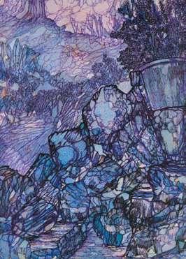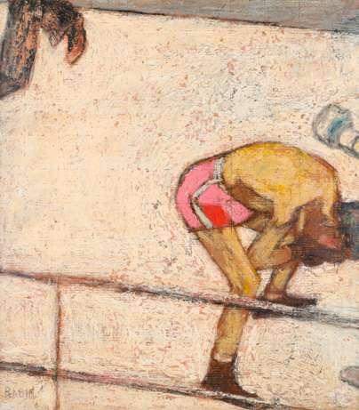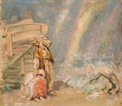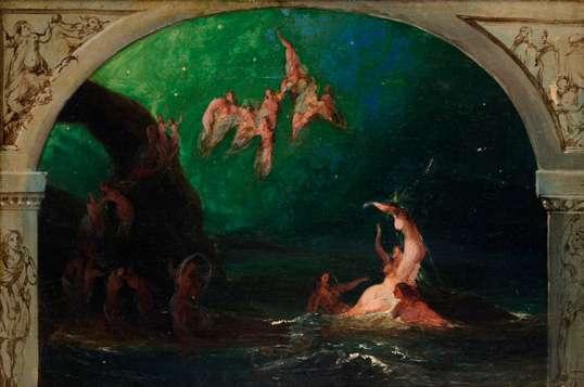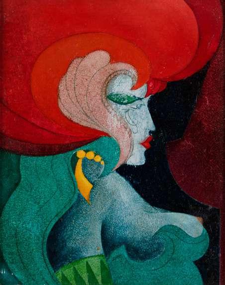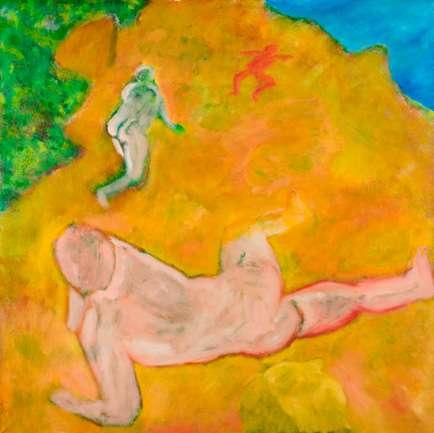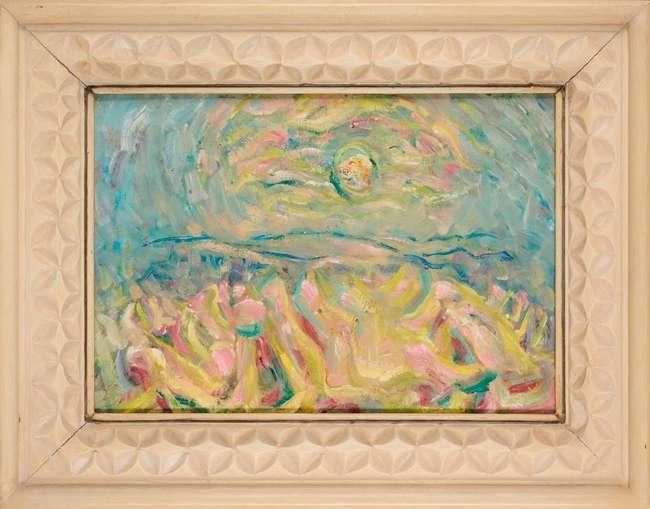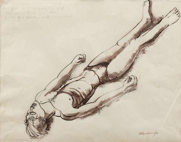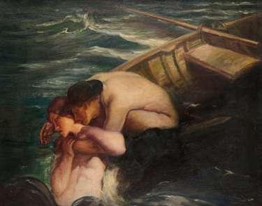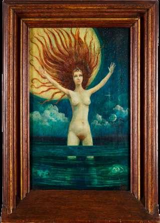 This enigmatic painting centred on a naked girl standing in the sea with her hair on end and her hands outstretched, clearly derives from Ad Astra painted in 1894 by Finnish artist Akseli Gallen-Kallela (1865-1931). In the present riff on Gallen-Kallela’s composition the figure stands higher in the water, the sky is cloudy, and the artist has added the heads of a man and woman floating half submerged in the water, suggesting a more sombre message.
