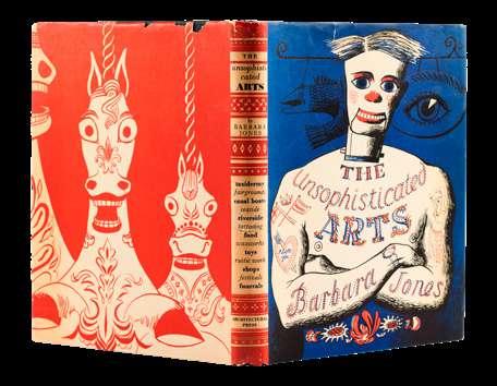 BARBARA JONES, THE UNSOPHISTICATED ARTS, published by The Architectural Press, First Edition, 1951, Hardcover, drawn and described by Barbara Jones, with 184 colour plates and black and white illustrations throughout, with a fabulous blue and red dust jacket designed by the author representing a tatooed ventriloquist, black boards with title in gilt lettering to spine, 192pp.