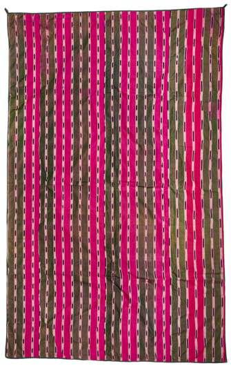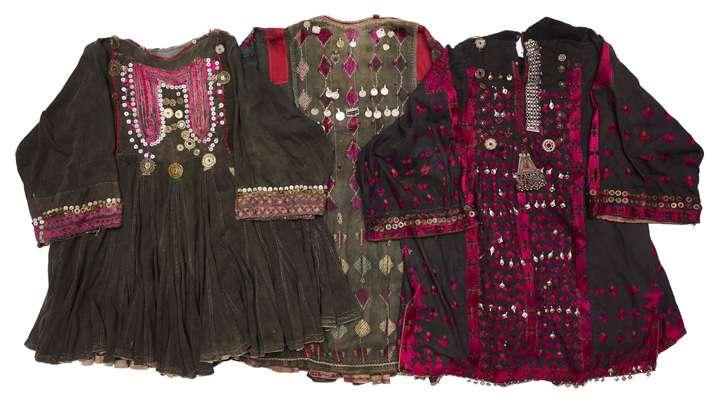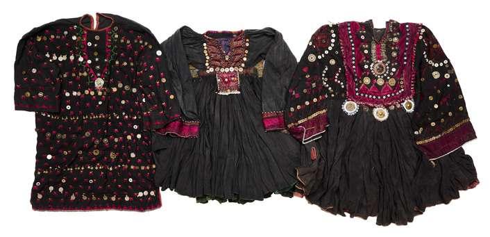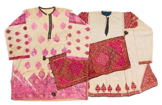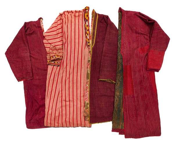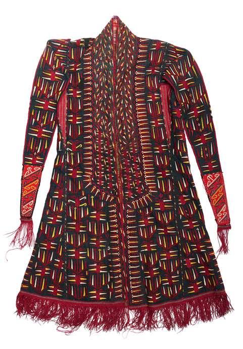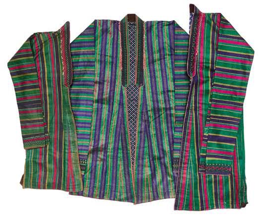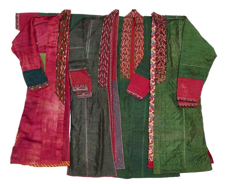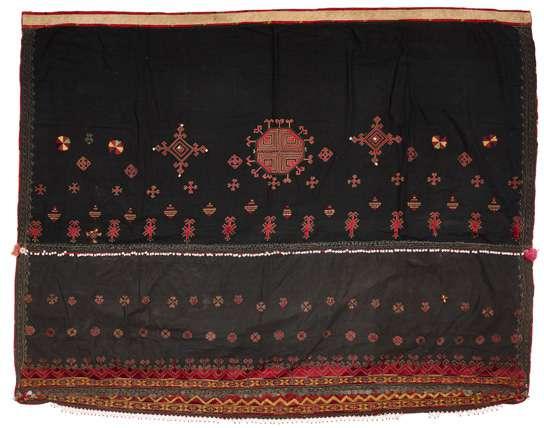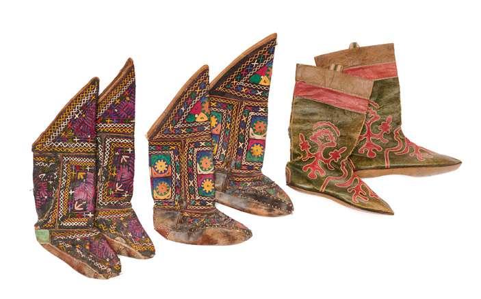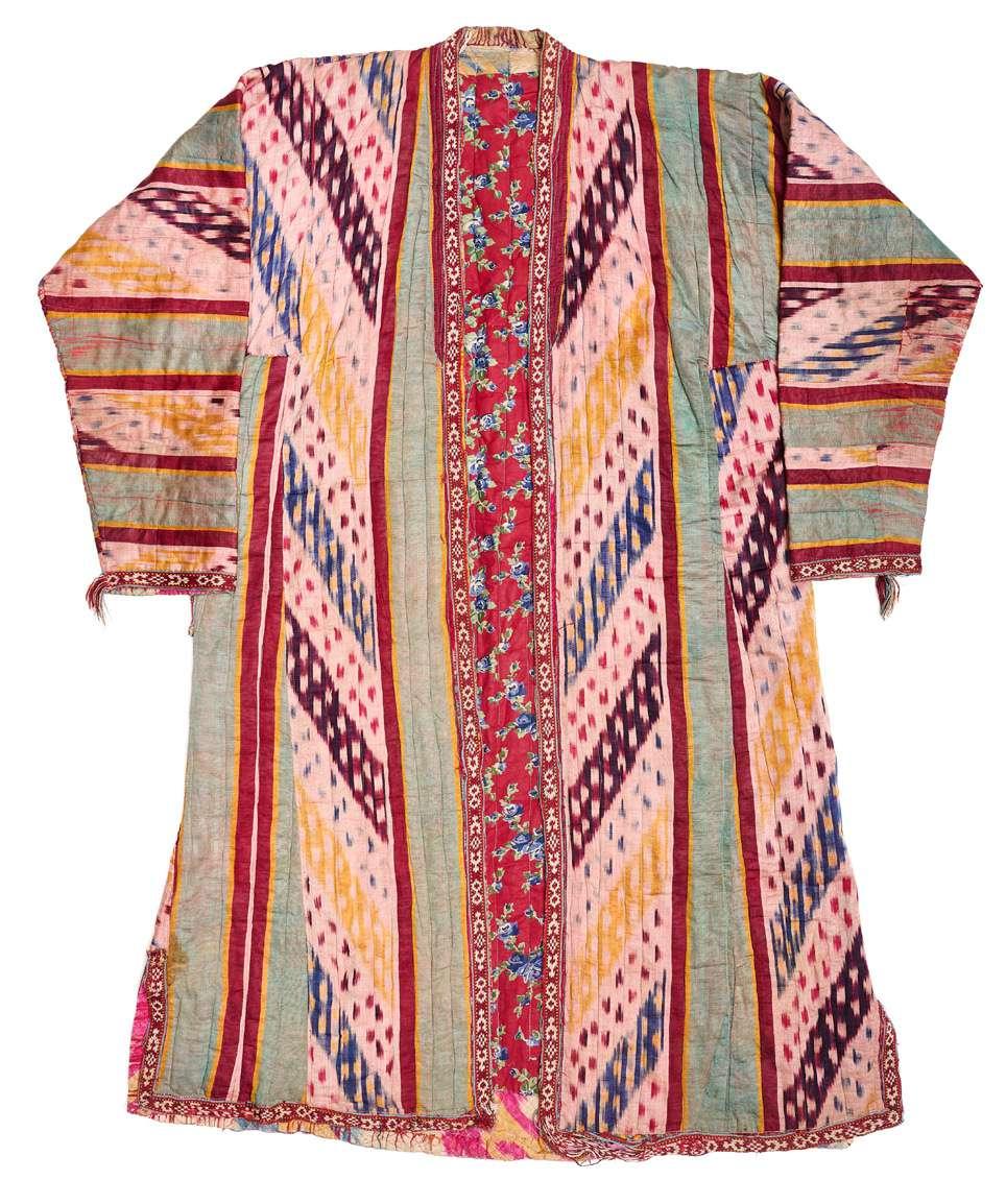 Uzbekistan and the adjacent lands have been famed for its silk fabrics since antiquity: those represented here date from the 19th and early 20th centuries. The Khans in 19th century Central Asia encouraged the production of woven silks, and the dying and weaving was carried out by numerous craftsmen ateliers, each specialising in an aspect of their manufacture. The quality and elaborateness of the fabrics reflected the social status and wealth of their owners; the brightly coloured ikat silks were used as wall hangings, bed quilts and made up into robes for men, women and children. The robes (chapan, though also referred to as khalat), were worn by the wealthier classes, layered for display and warmth. Examples of the less ostentatious simple striped chapan are also included here, as are the embroidered robes of the Turkman tribes. Ikat was also made up into munisak, shaped robes for women designed to show off the figure, and kurta - loose tunics. There are also examples of paranja, a kind of cloak, similar to the Turkman chyrpy. Embroidered and appliqued, decorated with ikat, beads and tassels, the hats, boots, bags and purses of Central Asia are also represented in this sale, as are the costumes and embroideries of Afghanistan, Kohistan and Pakistan which Pip Rau collected over a lifetime of adventure.