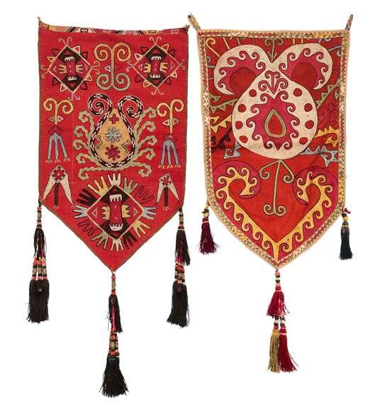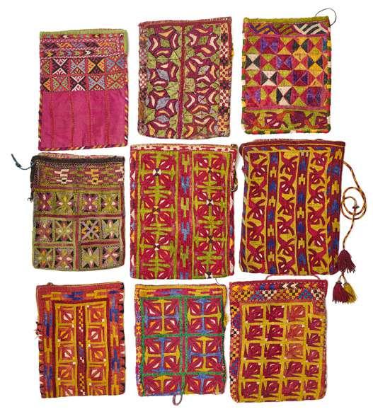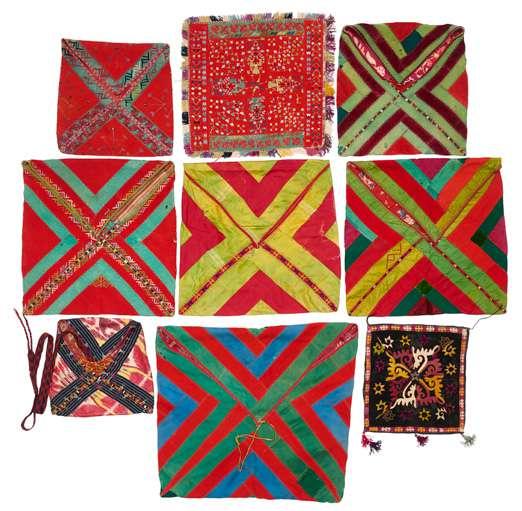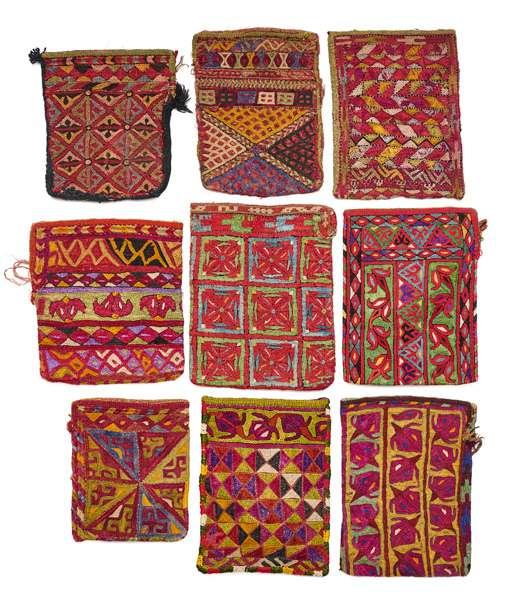 THREE EMBROIDERED AMULETS AND SIX EMBROIDERED POUCHES (BUKCHA), CENTRAL ASIA, CIRCA 1900