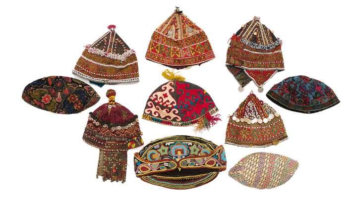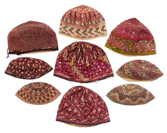 A COLLECTION OF TEN EMBROIDERED AND EMBELLISHED HATS, CENTRAL ASIA AND AFGHANISTAN, 20TH CENTURY