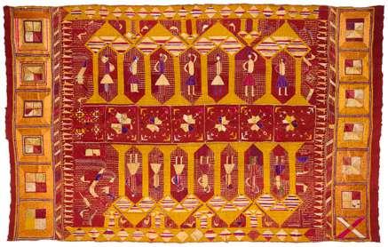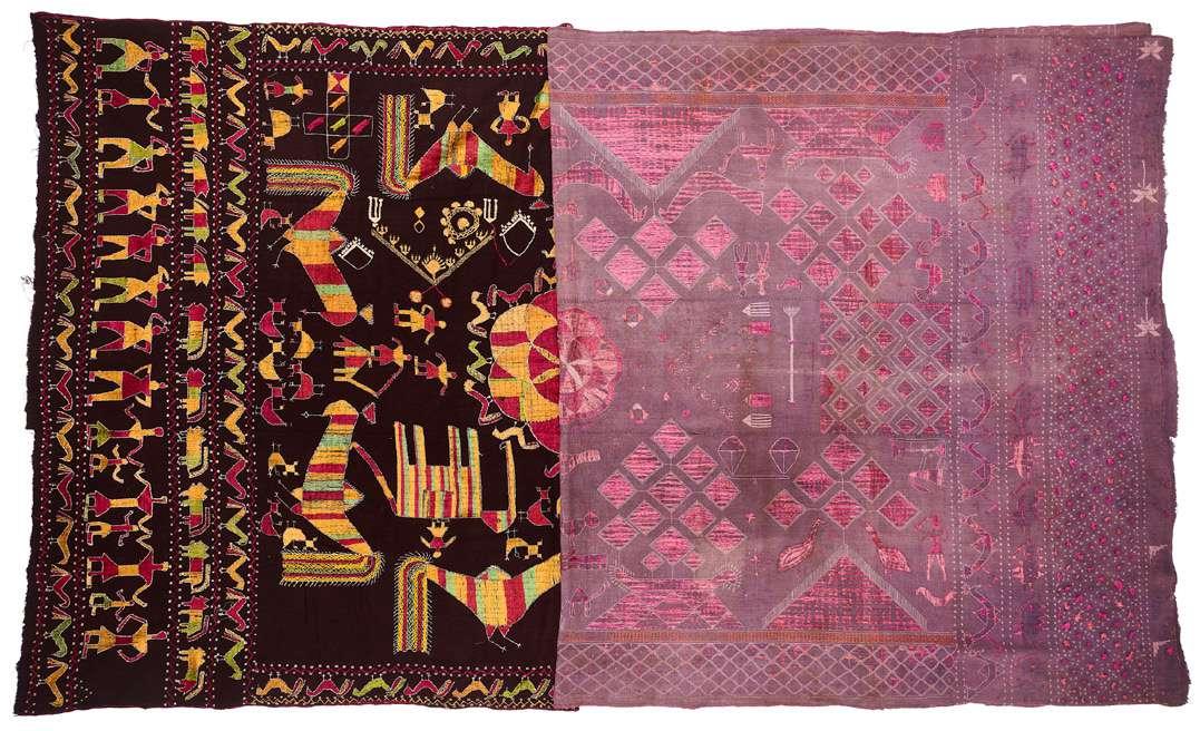 The first on a dark brown ground with a central flowerhead medallion, surrounded by animals, birds and geometric motifs, within borders of animals, birds and rows of dancing figures, together with a mauve ground embroidery with geometric motifs, figures and birds (losses), approximately 200 x 120cm and 240 x 130cm (2)