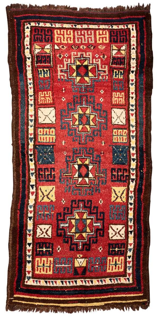 woven in two parts, with bands of polychrome hooked guls, approximately 340 x 150cm