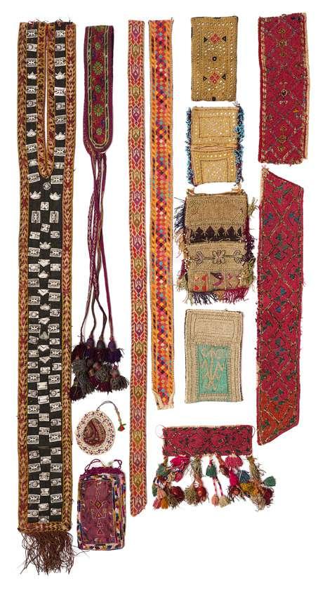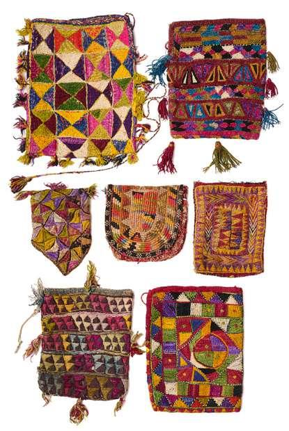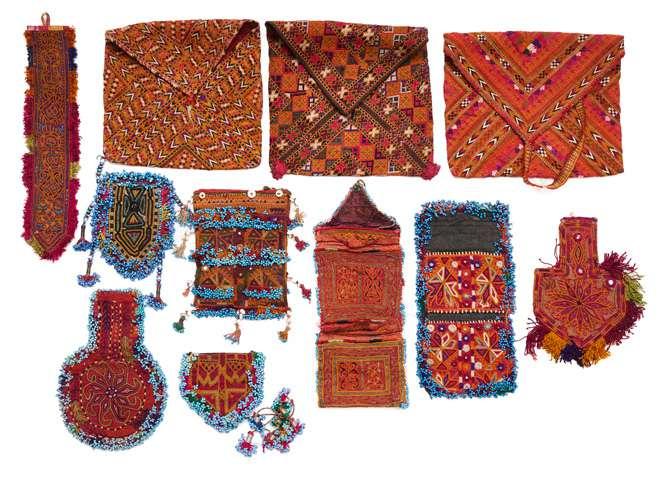 the Katawaz embroideries including a decorative band and small pouches and purses, decorated with silk embroidery, mica, buttons, blue glass beads, and tassels (11)