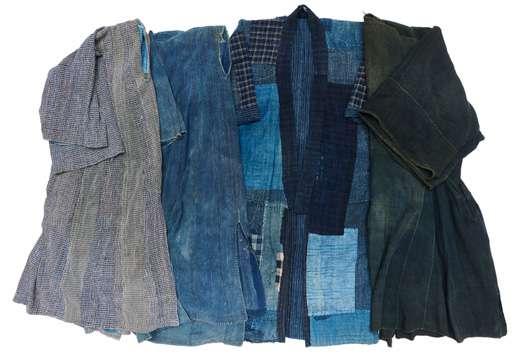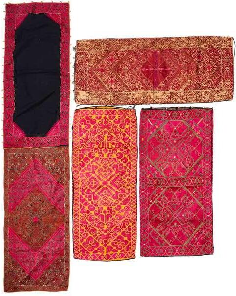 one now opened out with crimson and madder embroidery to face, and plain indigo ground with embroidered borders to reverse, one with yellow ground, one with olive green ground and one with light caramel ground, all densely embroidered, the largest approximately 80 x 39cm (4)