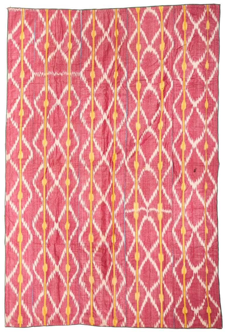 AN IKAT QUILTED PANEL, UZBEKISTAN, LATE 19TH CENTURY of adras ikat with yellow stripes and rosy pink diamonds, approximately 360 x 120cm