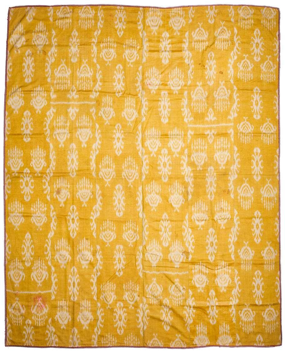 the adras ikat in pink and white with bold yellow stems with flowerheads, approximately 226 x 124cm