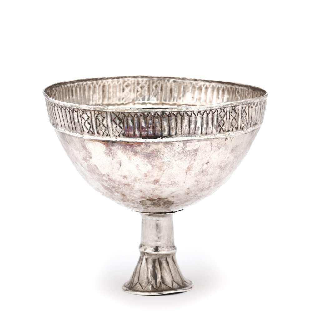 silver, decorated with twin bands of embossed arabesque and ropework decoration, palmette finials at either end, 6.5 x 5.5 x 5.5cm