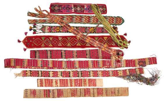 including a red velvet embroidered band, four cross-stitch embroideries, five fragments of similarly embroidered belts or bands, one with beaded veiling fringe, a length of tablet braid and an embroidered watch strap (12)