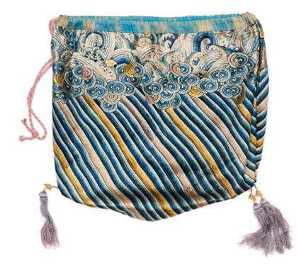 including 21 small purses and pouches, variously decorated in polychrome silks with geometric motifs, tassels, pom-poms and glass beads, together with an embroidered band (22)