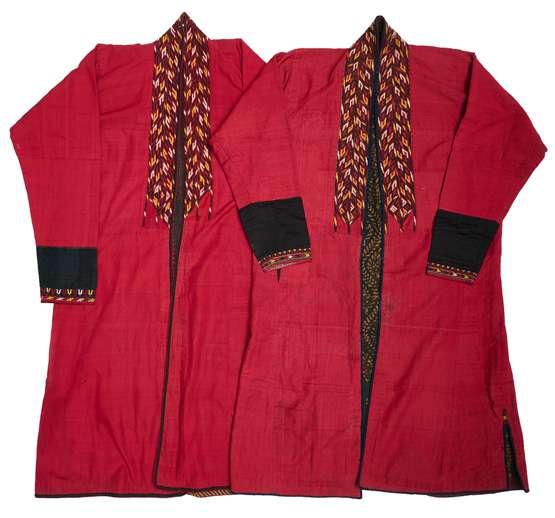of adras ikat, the first woven with polychrome vegetal motifs, printed cotton lining, tablet braid trim to cuffs, openings and hem, the second in red and white with complementary printed lining, edged in black braid, approximate length 120cm; 132cm