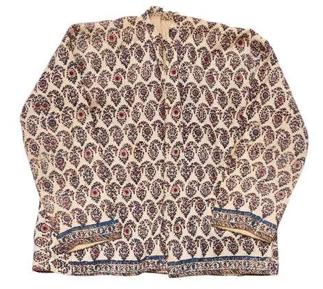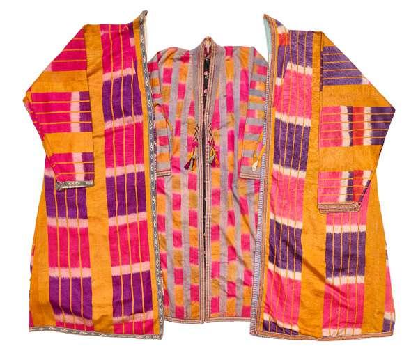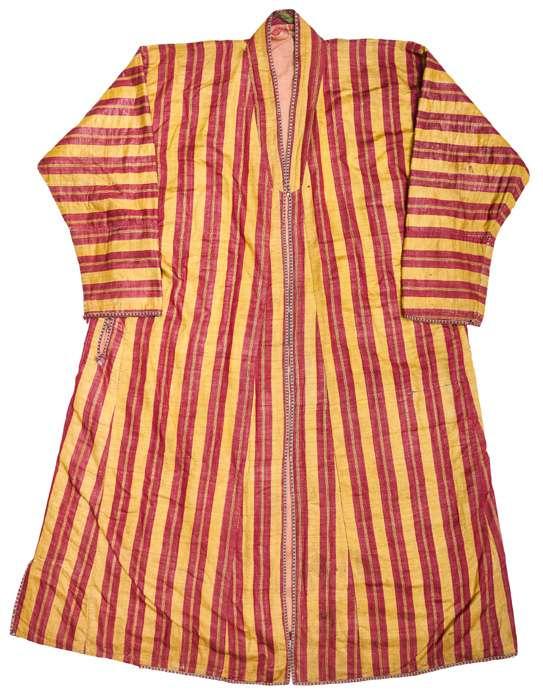 of adras ikat, with printed cotton lining, tablet braid edging to openings and cuffs, approximate length 110cm