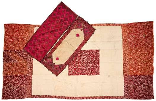 one quilt with red field with overall boteh and flowerhead medallion, ogival medallion border, plain red lining (approximately 130 x 85cm); one with blue ground, overall boteh, ivory medallion and spandrels, zig-zag border, printed cotton lining (approximately 150 x 100cm); one with ivory ground and overall small flower sprigs, narrow vinery border, printed cotton lining (approximately 110 by 88cm); together with A Finely Printed and Painted Sash, with overall botehs, palmette and boteh end panels, arabesque and palmette borders, approximately 170 x 45cm (4)