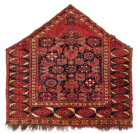 of pentagonal form, possibly an Azmalyk, or a saddle cover, indigo field with herati, madder spotted apex, stepped gul border, approximately 98 by 95cm