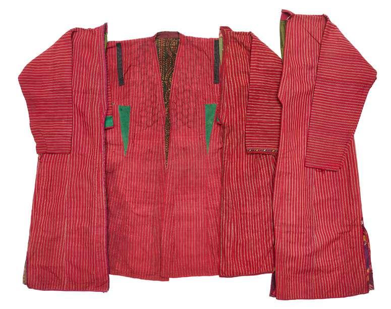 one of green and madder part silk striped plainweave, small floral printed cotton lining, elaborated tablet braid trim, the other of madder and indigo striped plainweave, printed cotton facings, both approximate length 115cm (2)