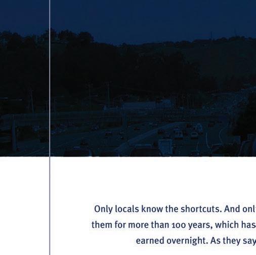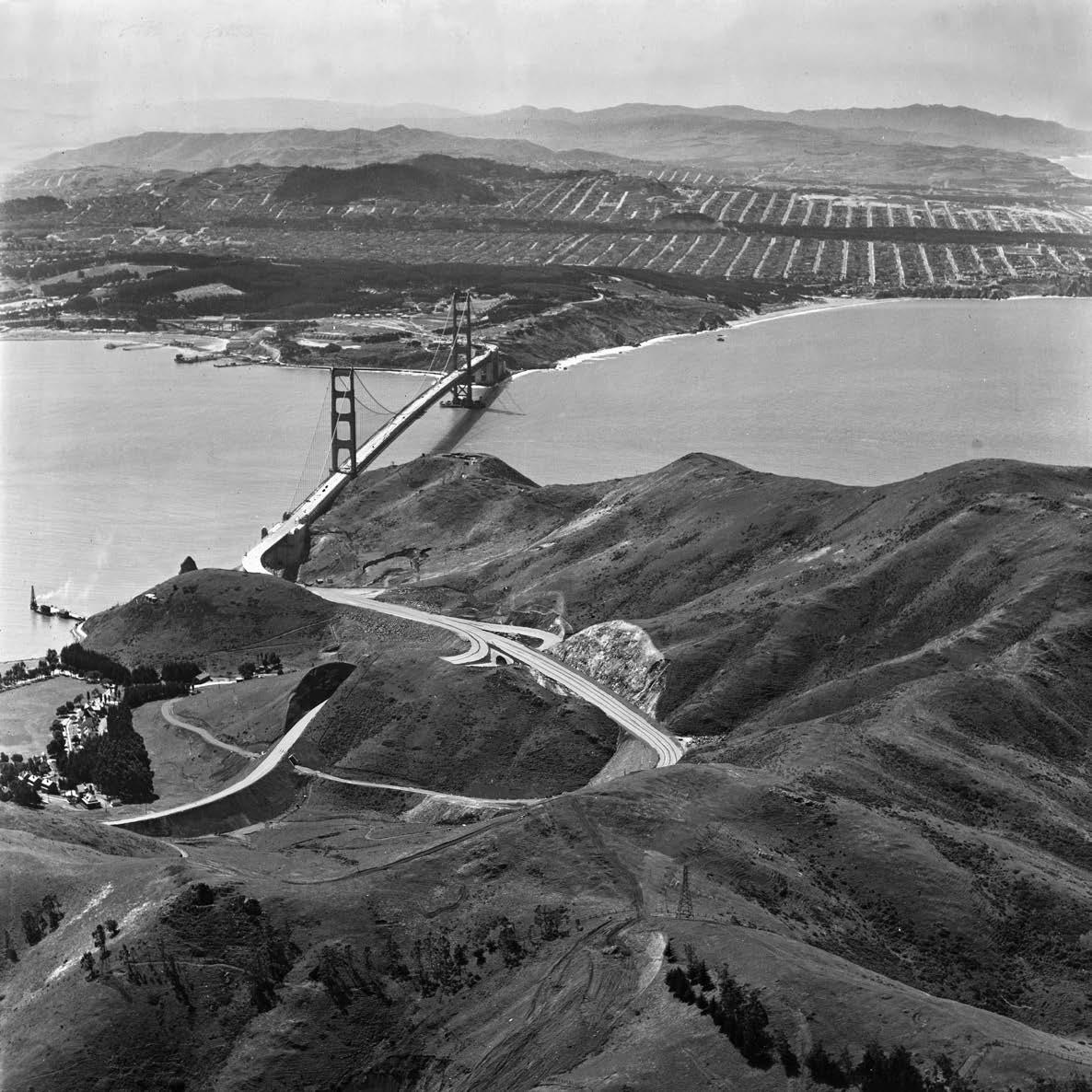 HAT, NO TRAFFIC? This aerial shot, taken days before the opening of the Golden Gate Bridge, shows not a car on Highway 101 leading into Marin County. At the time, Marin’s population was approaching 50,000. Then came World War II and many families found work in Sausalito’s shipyards. By 1950, there were 85,600 people in Marin, an increase of 72 percent. Over the next 10 years, the county’s population jumped another 72 percent to 146,820 (it’s now around 255,300). In 1970, increased tra c dictated that Highway 101 be doubled in width and the Waldo Tunnel be given a second bore. The above photo was shot by the late Raymond Moulin of Moulin Studios in San Rafael, whose collection of photographs of the West during the 1900s, particularly the Bay A rea, is one of the nation’s largest. m