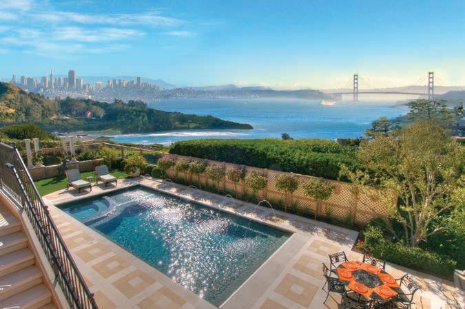 Two-story entry foyer with formal living and dining rooms, separate office with built-in desk and bookcases, and award-wining stainless steel kitchen with Viking, Meile, Sub-Zero and Russell appliances, three-stool counter, huge walk-through pantry and adjacent family room with fireplace, built-ins and view-side patio access. Upper level with large master suite and the entire San Francisco skyline and Golden Gate Bridge view, lavish bath with jetted tub and separate stall shower, and his and her dressing areas. Children’s wing with central homework area, built-in desks and bookcases, and two bedrooms and hall bath. Lower spa and pool level, with gym, separate steam room, refrigerated wine room, en-suite guest room and second family area with big-screen TV, five-stool bar, pool table and second kitchen with cooktop and oven, level lawn and view-side pool and spa. Five bedrooms, five full and three half baths, private, gated and the world-famous San Francisco and Golden Gate Bridge view… $7,500,000
