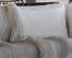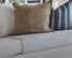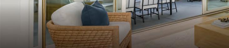 island, embellished with a fluted design, comfortably seats five and is outfitted for storage as well as food prep with an inlaid stone and metal workspace area. Twotone creamy white and sage-green cabinetry, a second prep sink, counter-to-ceiling Fireclay Tile, marble countertops and Urban Electric light fixtures complete the design. Lavender velvet Sun at Six counter chairs add a touch of whimsy to the space. Between the kitchen and family room, a sage-hued built-in storage component accented by hand-painted Tabarka Studio