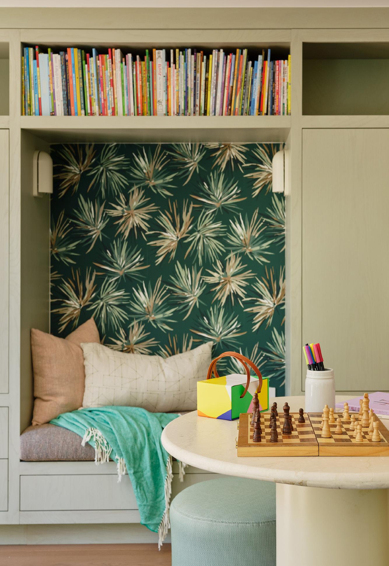 Decked out in shades of green, the playroom features a reading nook and plenty of storage.