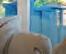 Clockwise, from top left: A two-tone wall in the mudroom hides scuffs; The sunken lounge area offers plenty of room to sprawl out on the built-in, wraparound couch; Cheery pops of color embellish the powder rooms.