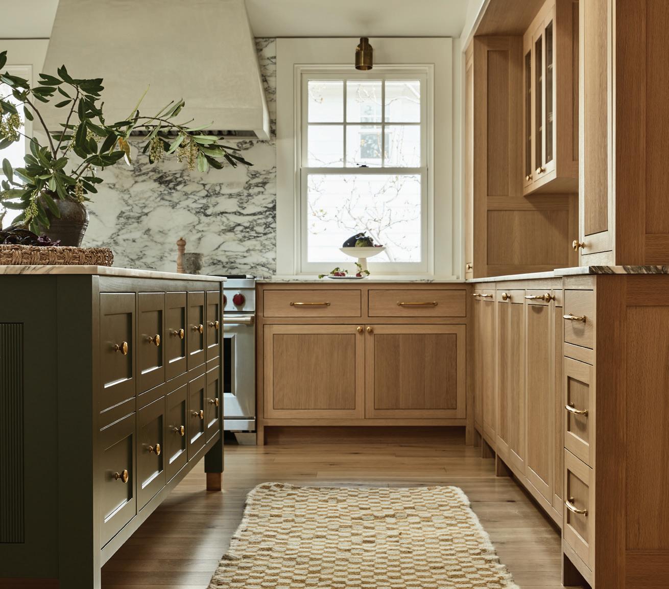 The focal point of the kitchen is the custom white oak and island — a modern interpretation of a classic English worktable.