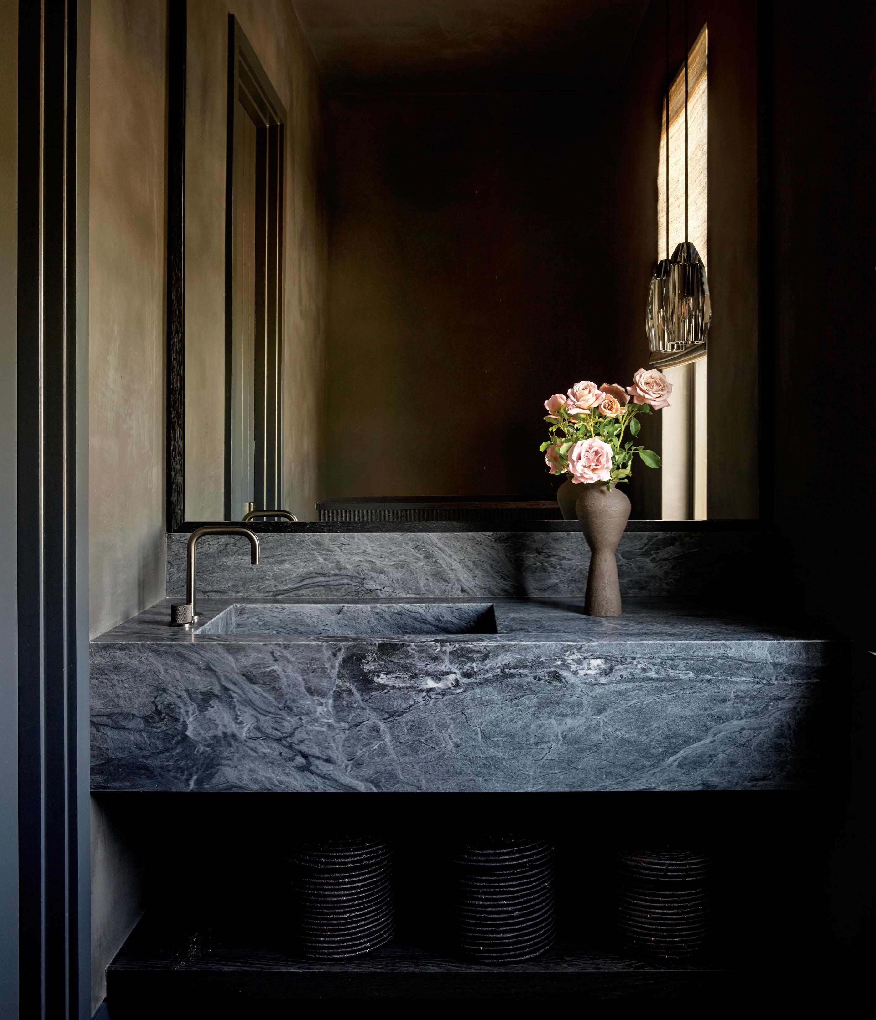 Cheery accents also enliven the bathrooms. A salmon pink door adds a pop of color in the navy-and-white kids’ bathroom, which features matching parallel vanities. A luxurious guest bathroom pairs multi-hued penny tile with Calacatta marble. And in the primary suite shower, vivid green Ann Sacks wall tile, geometric floor tile and dual floating marble benches make a dramatic statement. Says Majit, “The brief for this house was ‘fun, happy and fresh but still sophisticated,’ and I think we did just that.”