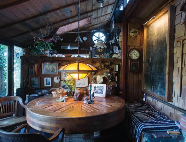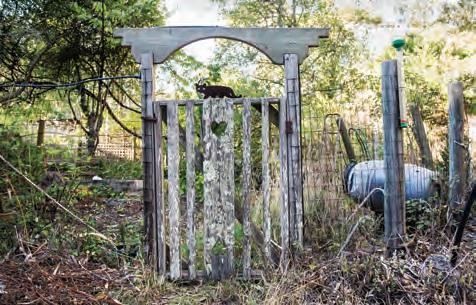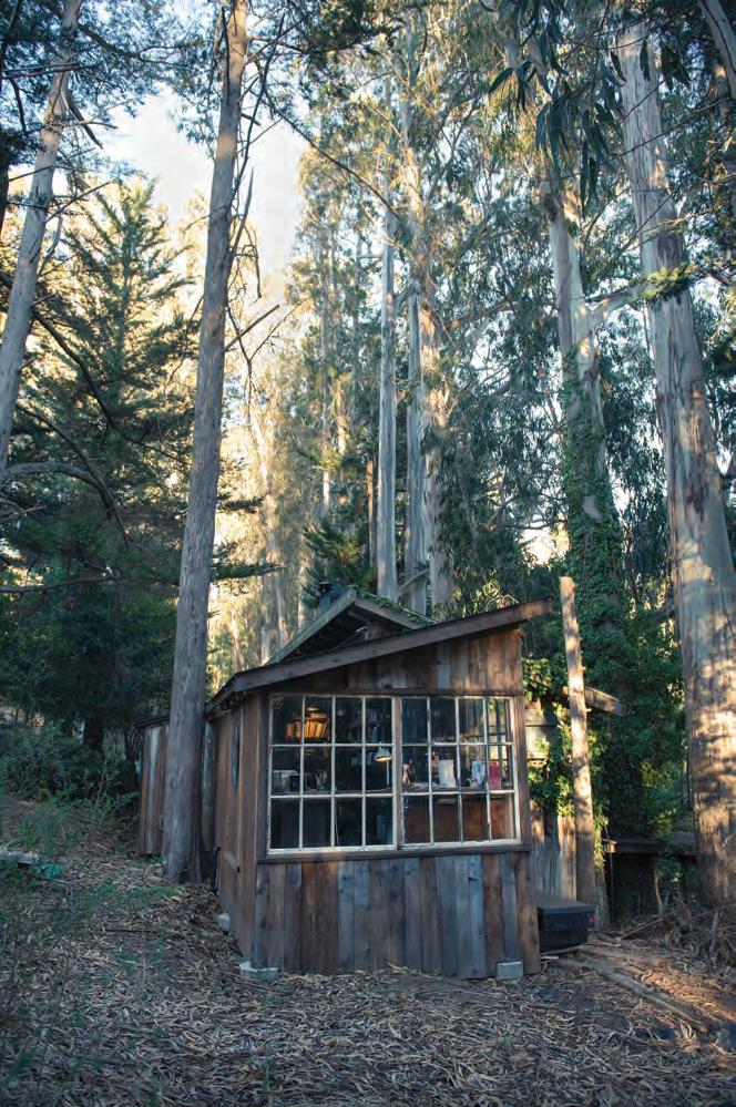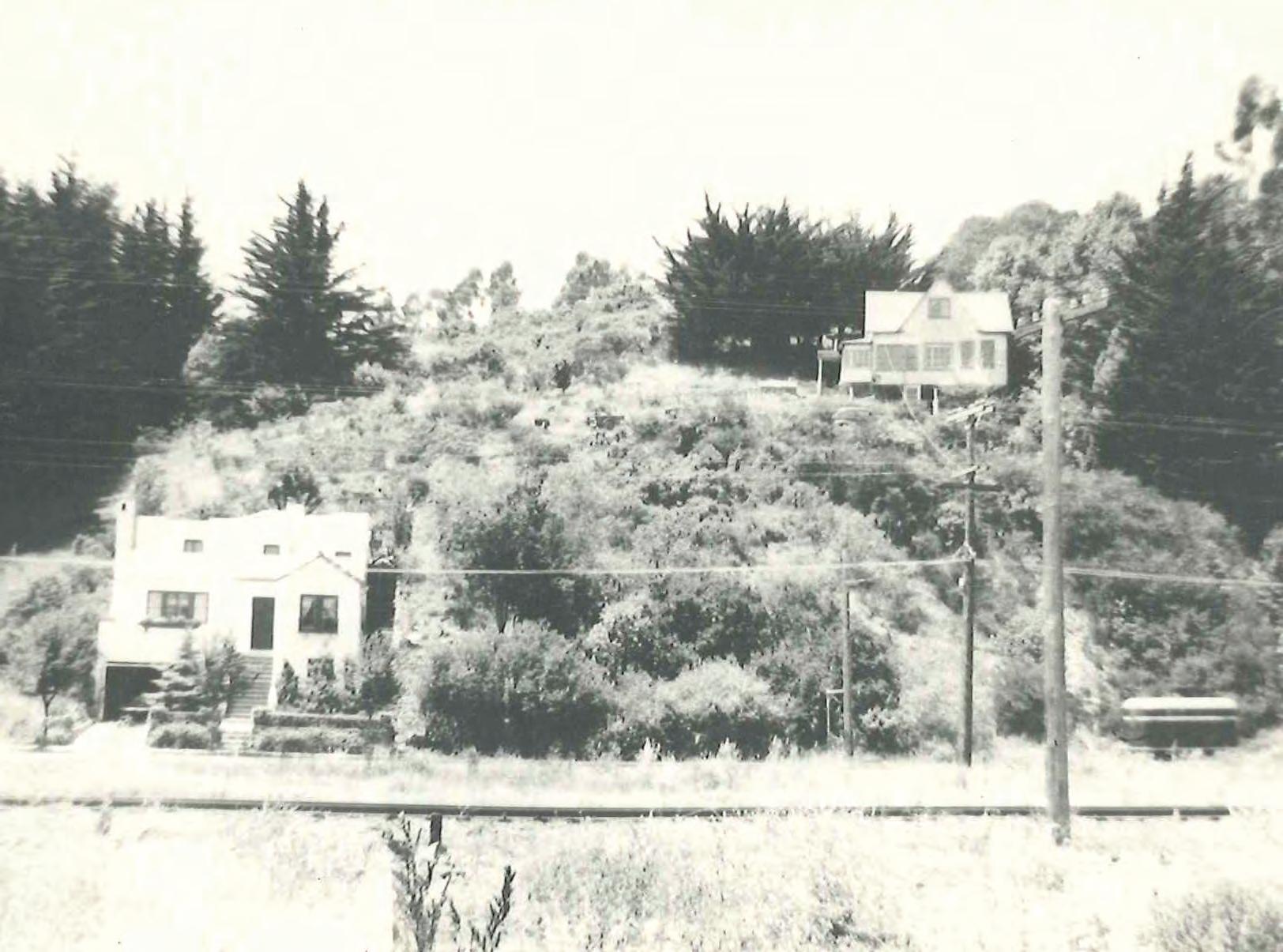 the early 1930s until 1995, when the most recent occupant, Schumaker’s Aunt Meda, passed away. The then-vacant home soon became a hangout for Tamalpais High students, whose school was a stone’s throw away. This picture, taken in the 1920s, shows the house on its original foundation with two wells and a basement level; it was moved (to the left, on the hill above the other house pictured, which still exists as the Mill Valley Pet Clinic) in 1948 because of earthquake damage. Little is known about the origins of this property, and this image, provided by Schumaker, is the fi rst historical photo in the local public record. m
