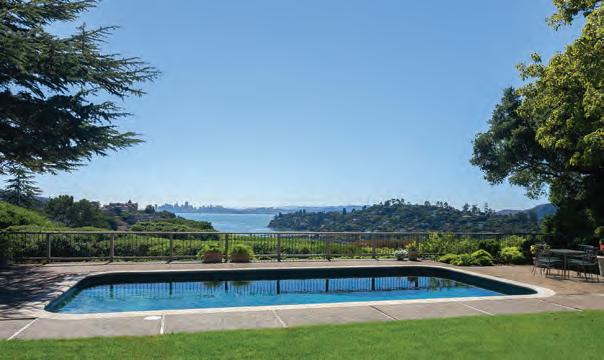 Blessed by an abundance of natural beauty, this elegant 3000+ square foot four bedroom, three bath home affords serenity and privacy while displaying the finest materials and craftsmanship. Visually striking interiors are enhanced by the spectacular bay views, which extend from the City of San Francisco through the Golden Gate Bridge and all the way to Mount Tamalpais. In a breathtaking setting the elegant and well-proportioned rooms display high ceilings. Most rooms or hallways have exterior doors that lead to multiple view decks, the pool patio or the living room patio with its 180-degree views.