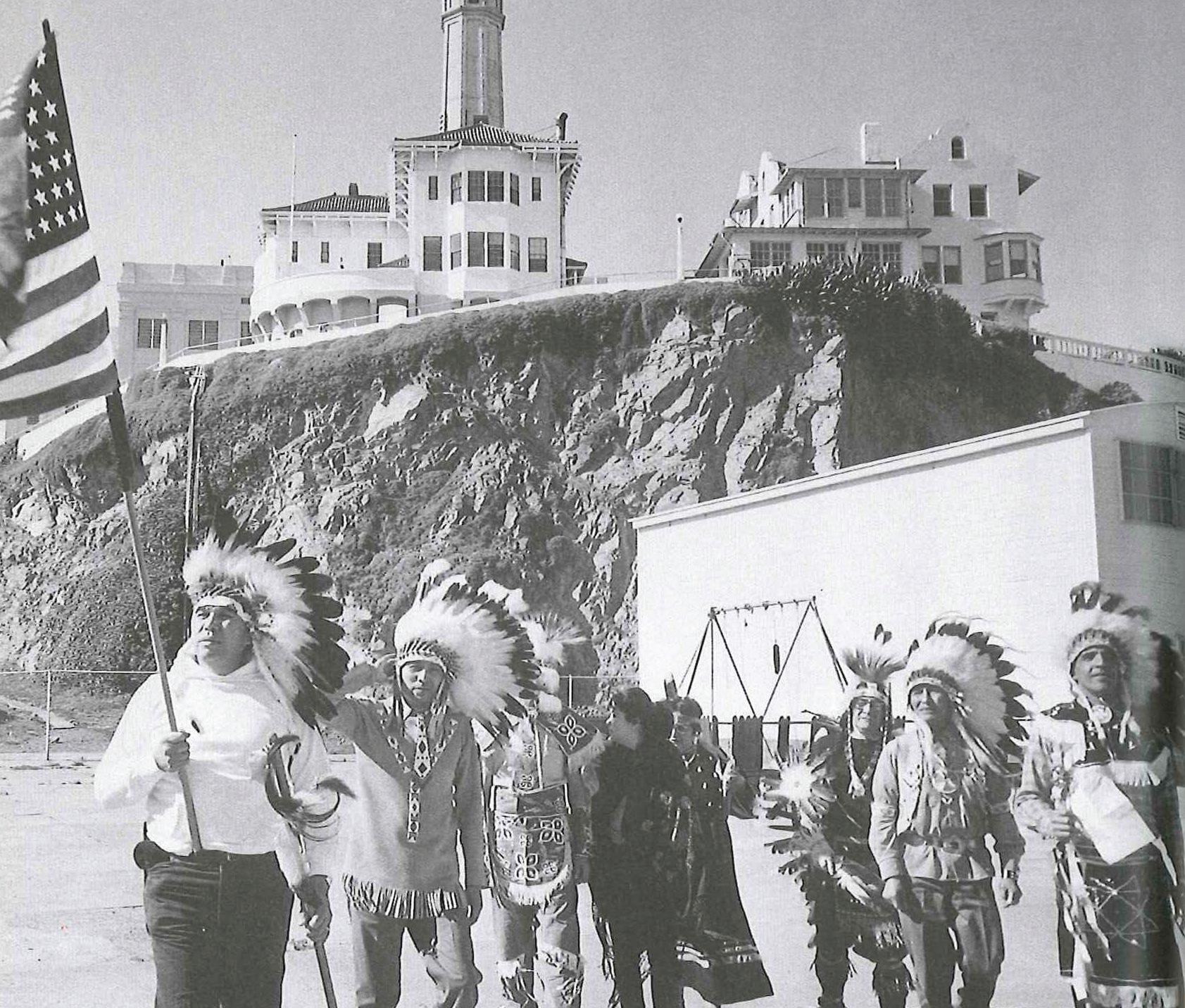 to claim A lcatraz, where the federal penitentiary had by then been out of commission for six years, for Indian possession. A fter landing in three darkened boats, the parties, mostly Native A merican college students, clamored onto the island with boxes of food, clothing and supplies. Security guard Glen Dodson spotted them, turned on his flashlight and yelled, “Mayday, Mayday, the Indians have landed.” Fortunately for the intruders, Dodson was part Cherokee and so, according to Goldstein’s book, he spent much of the night chatting with occupiers. It wasn’t until late afternoon that headlines screamed “INDIANS SEIZEALCATRA Z.” The occupation lasted a year and a half, until June 11, 1971, during which the island’s 94-foot-tall water tower was adorned with gra ti reading “PEACE AND FREEDOM W ELCOME HOMEOF THE FREE INDIAN L AND.” A recent $1.1 million National Park Service restoration of the tower included plans to repaint those words atop A lcatraz’s tallest structure. “That message is definitely part of the island’s history,” explained the project’s manager. A nd it all started at the No Name. m