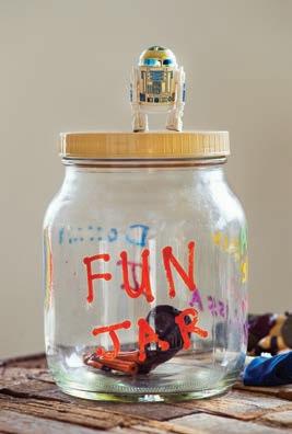 Clockwise from top: The living room features a wall of windows; an iron bed from Charles P. Rogers Beds in New York; the spiral staircase, a new addition, leads to a bonus room below; the red door and blue cement floor of the bonus room; Ian’s childhood “fun jar,” used to store his Star Wars action figurines; Jacqueline, Drayson, Ian and labradoodle Clyde have fun on the back deck.