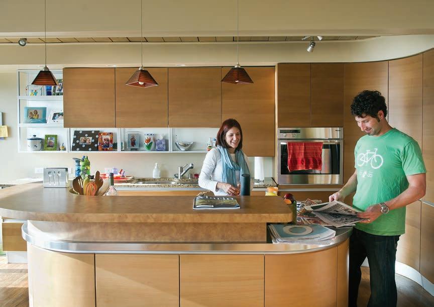 Above left: Jacqueline and Ian Jaffee in their kitchen; an art wall with family photographs and their children’s art decorate the wall behind them.