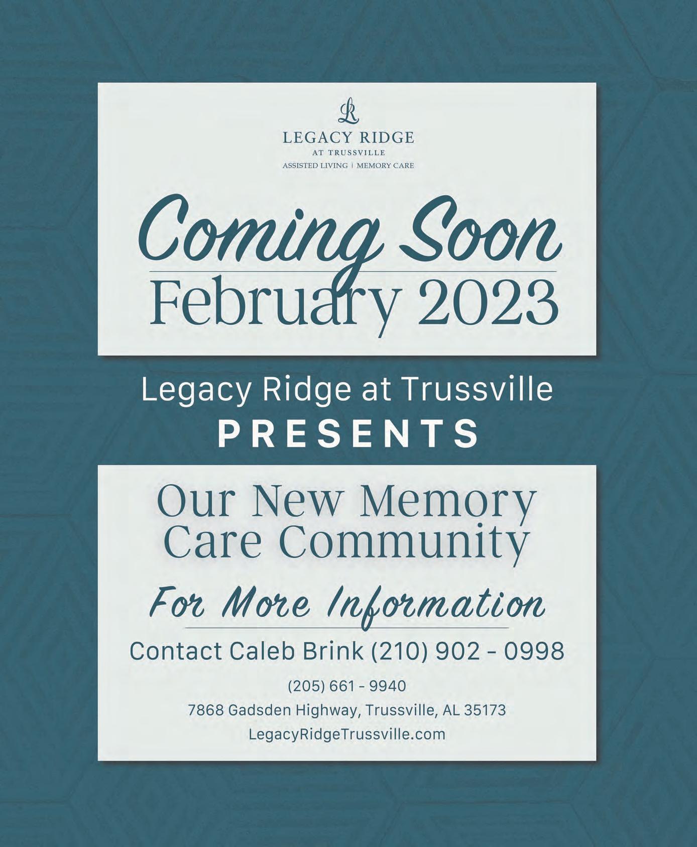 Legals: Cahaba Sun is published monthly. Reproduction or use of editorial or graphic content without prior permission is prohibited. Cahaba Sun is designed to inform the Trussville community of area school, family and community events. Information in Cahaba Sun is gathered from sources considered reliable but the ac curacy cannot be guaranteed. All articles/photos submitted become the property of Cahaba Sun. We reserve the right to edit articles/photos as deemed necessary and are under no obligation to publish or return photos submitted. Inaccuracies or errors should be brought to the attention of the publisher at (205) 313-1780 or by email.