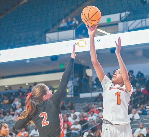 Left: Kristen Winston (1) finishes the final seconds of the game during the Hoover vs. Hillcrest 7A AHSAA state basketball championship game at the Legacy Arena in Birmingham on March 1.