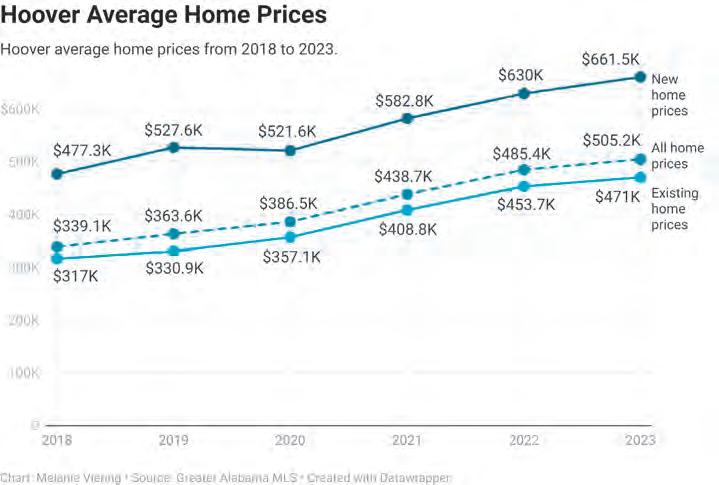 Hoover certainly has a higher volume than other suburban markets, with its 1,421 home sales in 2023 comparing to 610 in Vestavia Hills, 554 in Trussville, 465 in Pelham, 446 in Bessemer, 427 in Chelsea, 407 in Calera, 337 in Helena, 352 in Alabaster, 302 in Odenville, 300 in Homewood and 280 in Mountain Brook, according to MLS data.