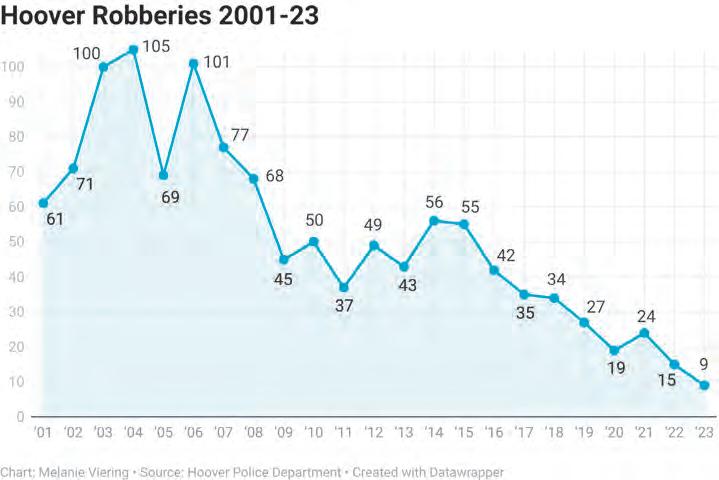 The national robbery rate was 66 robberies per 100,000 people, according to Statista, so Hoover’s nine robberies in 2023 were far below that average. The average number of robberies in Hoover over the past nine years is 29, records show.