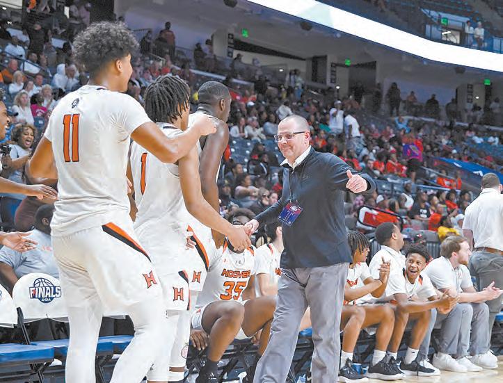 Left: Hoover head coach Krystle Johnson during the Class 7A state championship game between the Lady Bucs and Sparkman at the BJCC’s Legacy Arena on March 4. The Lady Bucs defeated Sparkman 55-44 to claim the Class 7A state title for the third consecutive year. Right: Hoover head coach Scott Ware high-fives his players as the Bucs defeat Central-Phenix City 84-66 to claim the Class 7A state title at the BJCC’s Legacy Arena on March 4.