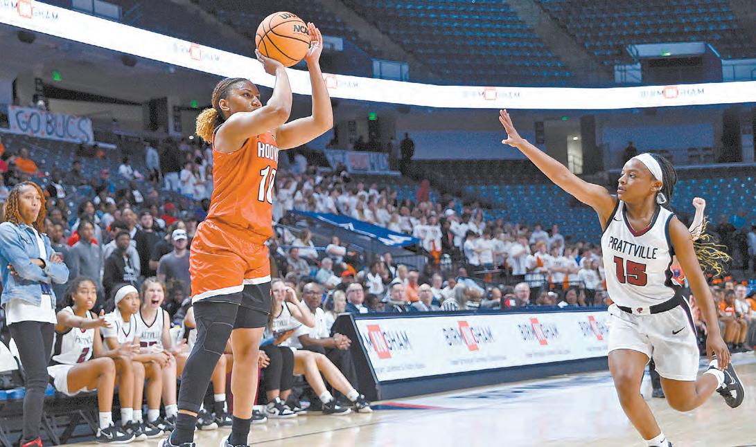Hoover’s Reniya Kelly (10) shoots a 3-pointer during an AHSAA Class 7A girls state semifinal game against Prattville at Legacy Arena at the BJCC on March 2. Photos by Erin Nelson.