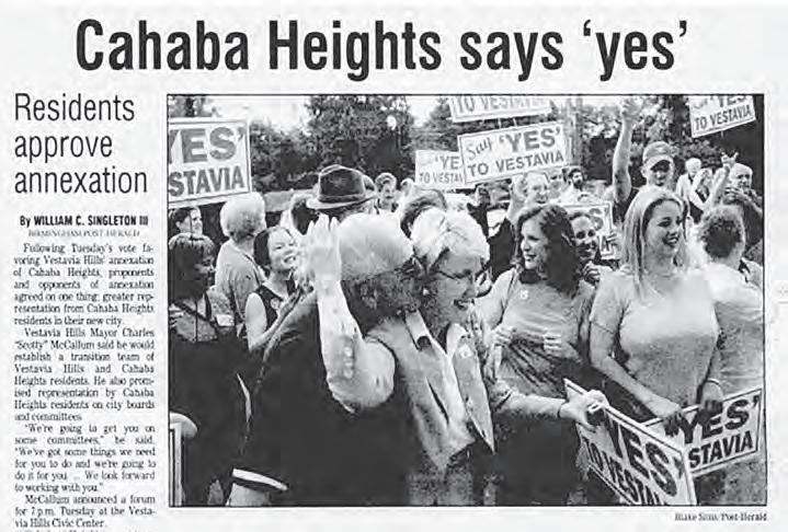 In a referendum, more than 1,600 Cahaba Heights residents cast ballots. The result: a 2-to-1 vote in favor of annexation. The decision added more than 5,000 people to Vestavia’s population — making it, at the time, the third-largest city in metro Birmingham, behind only Birmingham and Hoover.