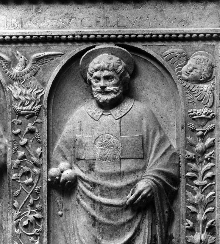 Cripta del duomo di Spilimbergo. Altare lapideo del 1472. San Nicola tiene in mano il suo tradizionale simbolo: tre sfere ricavate dalla fusione dei calici d’oro della sua chiesa con cui provvide a fare la dote a tre fanciulle povere che il padre voleva avviare alla prostituzione.