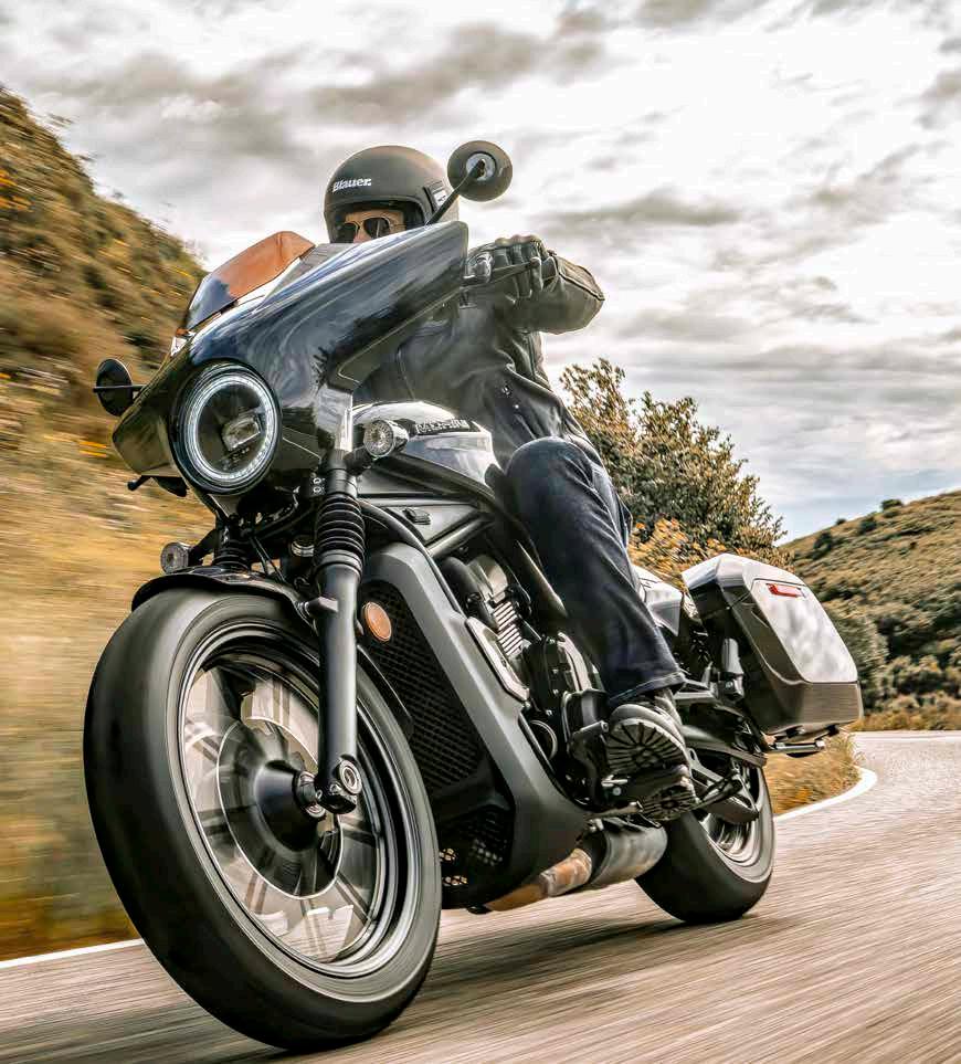 Calibro renueva su oferta con dos versiones: la conocida Custom y la novedosa Bagger. Se trata de una moto de estilo americano con líneas musculosas y contemporáneas, caracterizada también por una conducción dinámica y una accesible posición de manejo. Además, el motor bicilíndrico en paralelo crece de tamaño en ambas variantes para pasar ahora de los 649 centímetros cúbicos originales a los 693 cc de los modelos 2025, mejorando así la entrega y refinamiento al disponer de una curva más lineal en todo el rango de aceleración.