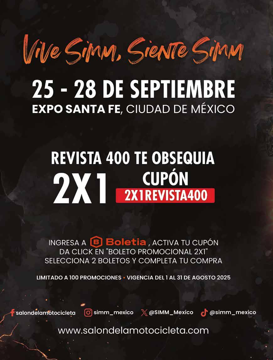 Revista de motociclismo de Distribución Nacional. Revista mensual edición 177. Responsable: Richard Marelli. Número de Certificados de Reserva otorgado por el Instituto Nacional del Derecho de Autor: 04-2015-022311422900-102, Número de Certificado de Licitud de Título y Contenido: (en trámite), Domicilio de la Publicación: Ejército Nacional No. 67, Col. Verónica Anzures, Del. Miguel Hidalgo. C.P. 11300, México D. F. Tels.: 55 5256 3941. Revista 400 no está involucrada en ninguna transacción por los anuncios publicados, por lo tanto no recibe comisión por estos actos, ni es responsable de la calidad, estado y/o veracidad de los mismos. La opinión de los columnistas es responsabilidad exclusiva del autor y no refleja necesariamente la opinión de esta casa editorial.