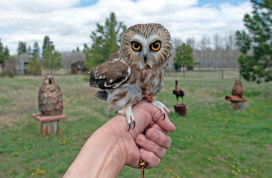 state rehabilitation, possession, eagle exhibition, and falconry permits to keep raptors on her ranch outside of Missoula. She founded Raptors of the Rockies in 1988 with the purpose of education and to provide rehabilitation for young and injured birds. Not all rehabilitated birds are able to survive back in the wild, so 25 years ago, her purpose shifted to solely providing a lifetime of quality care for permanently disabled and imprinted raptors and falconry birds. Her first bird was Clive, a Redtailed Hawk with one eye.