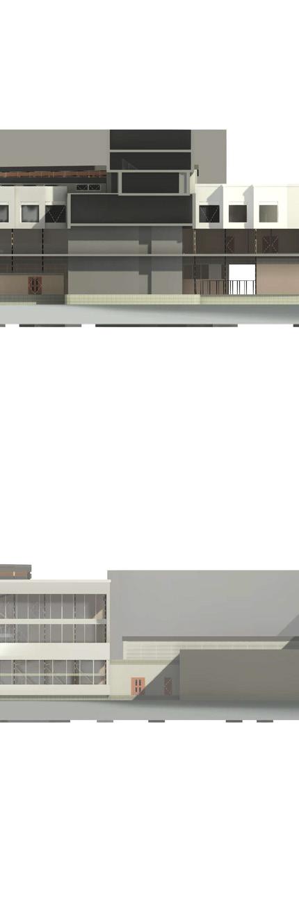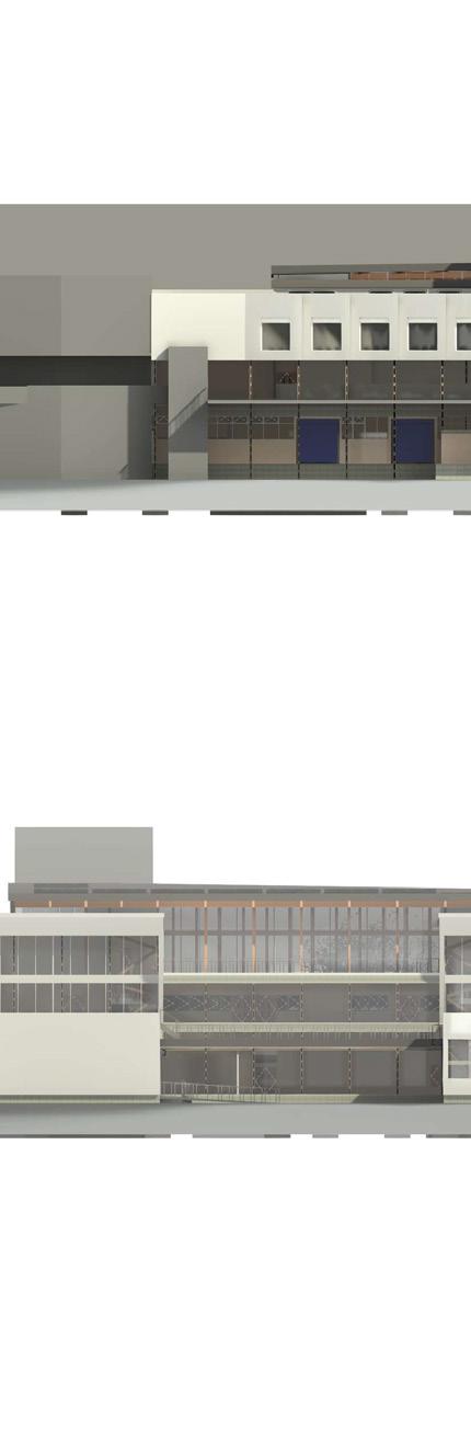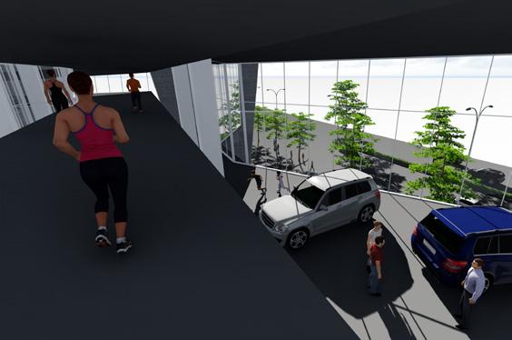 In another perspective, I tried to display not only car brand but also the sport center. People can run at the mezzanine floor from the top of the showroom to outdoor cantilever structure grew from the facade. I also create a slanted climbing wall at the West facade to enrich the dancity of the building.