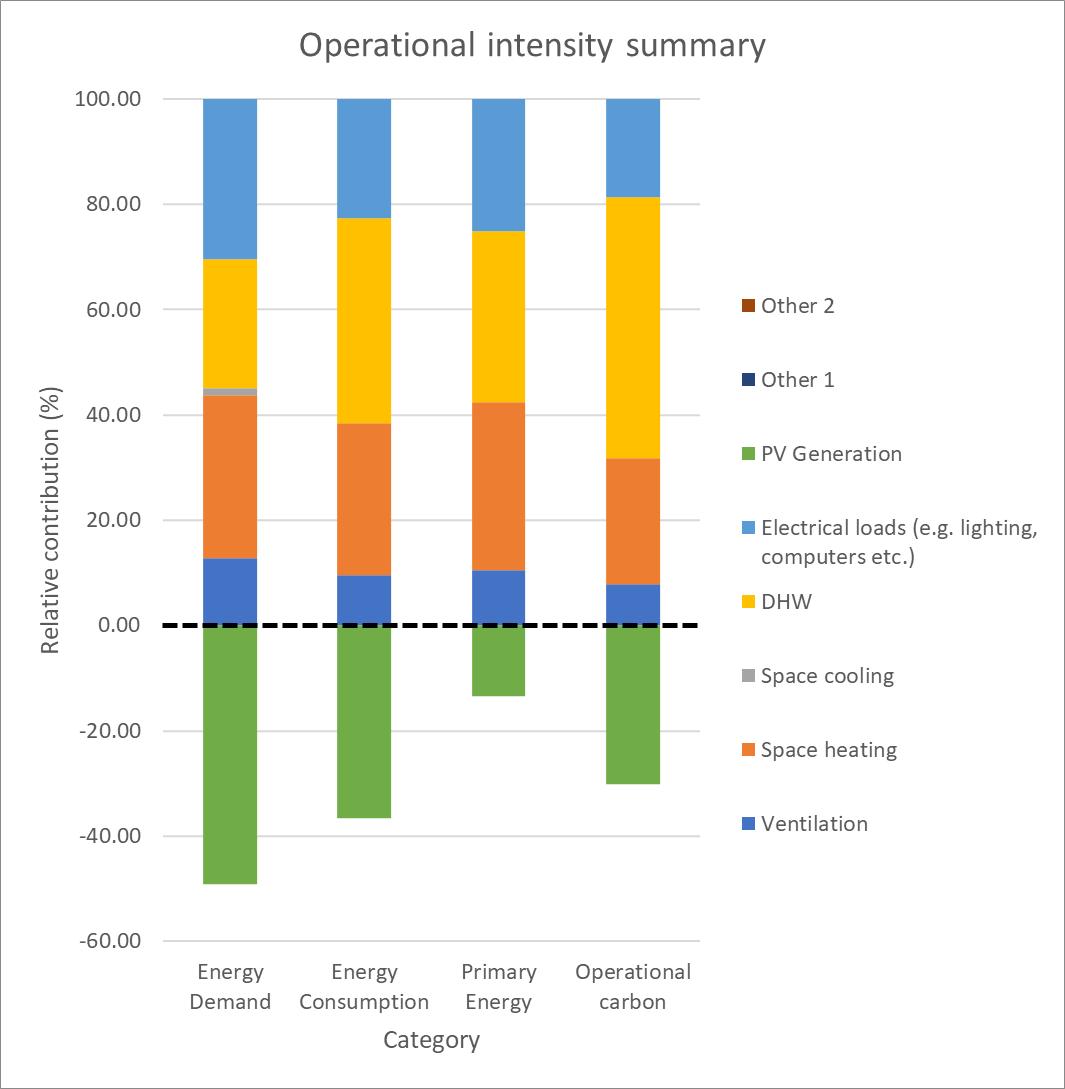 Due to the building produces 4 kgCO²/m²(TFA)/year because of the DHW requirement, even if we install the PV panel on the roof and PV glass on the roof and on the west facade, it could only reduce the energy consumption but not be able to reach the Net zero.