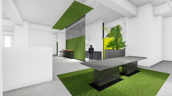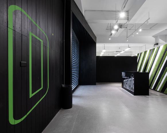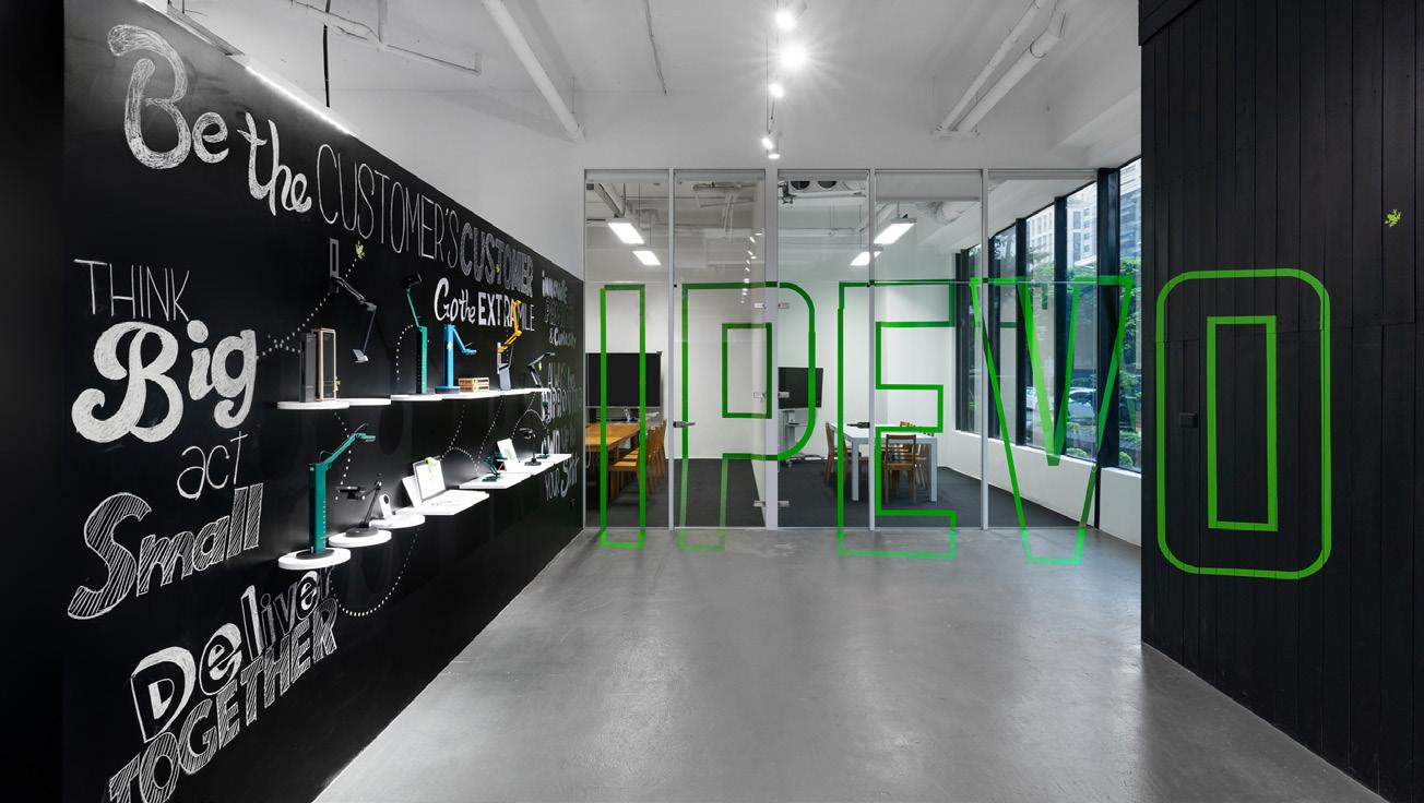 For the new corporate headquarters of IPEVO Inc, the industry leader in education technology, we designed a vibrant, high contrast color blocking interior in green, white and black with multiple plays on visual perceptions in homage to the company’s document cameras for teaching or demos and their concept driven by the phrase “see what I see.” In the space, expanses of turf hovers in expanded metal and a logo fragmented into space, alongside elements that reverse weight and depth expectations.