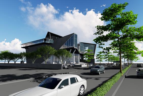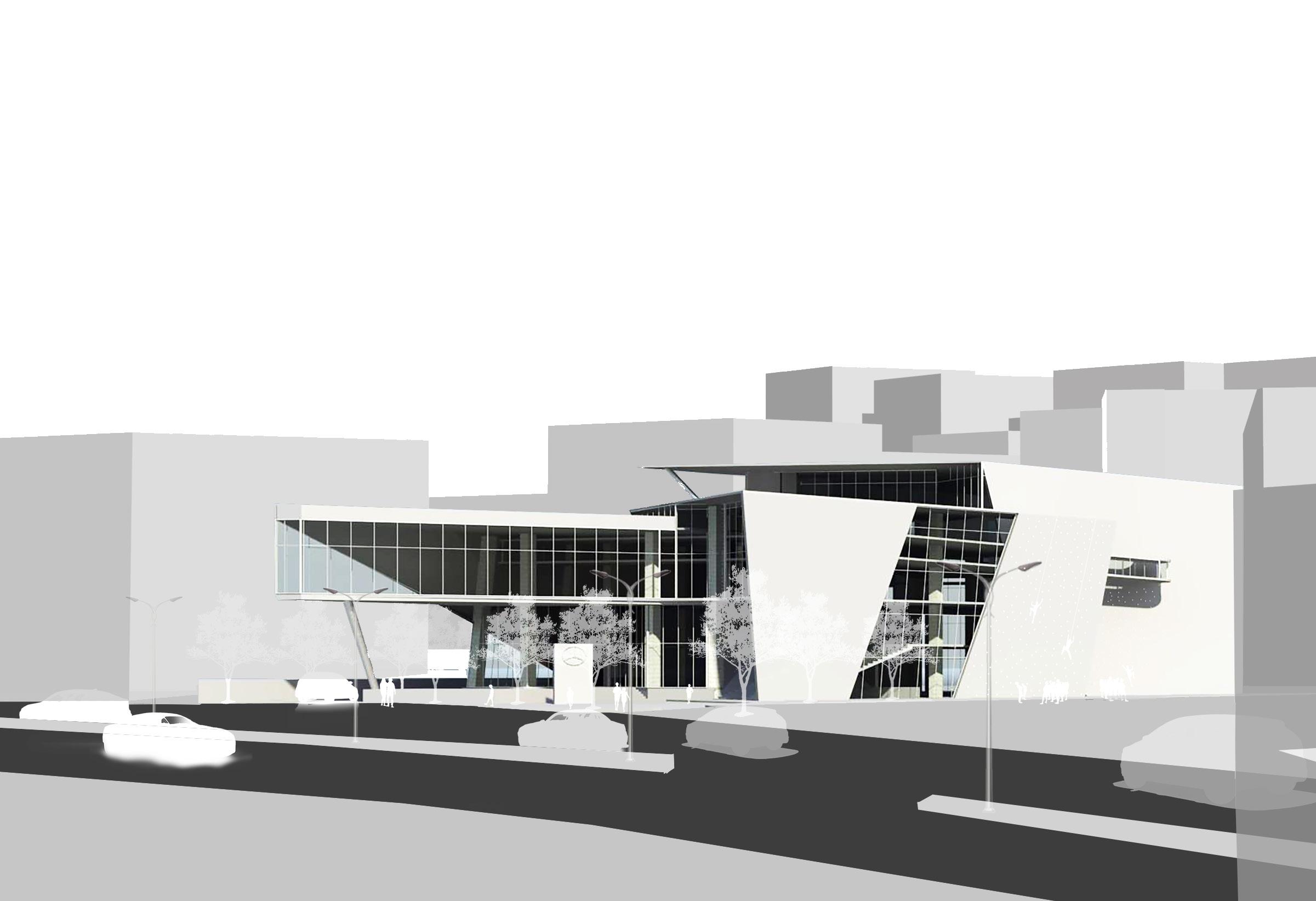To display the car to people standing on the road, I create a cantilever structure toward the way of traffic flow for the display area,and it became the entrance of the showroom at the same time. By the split-level, the entrance of sport center is at second floor with a special stairs.