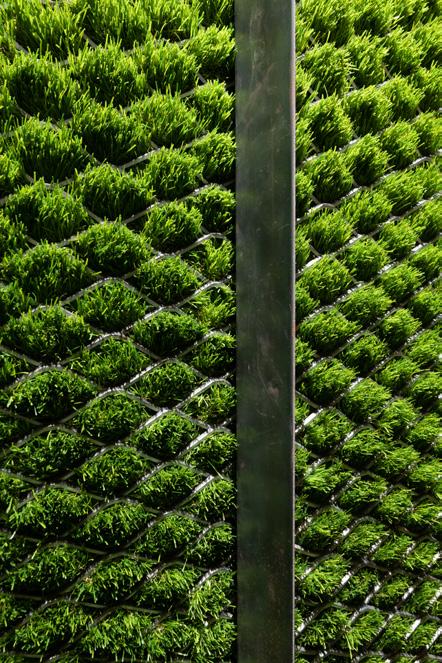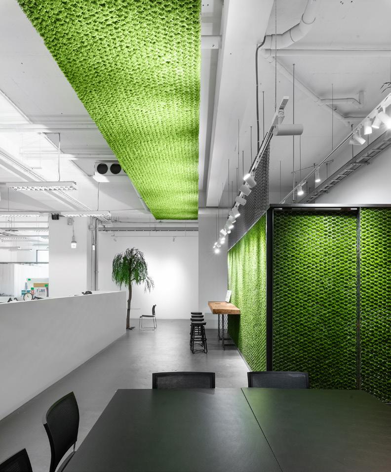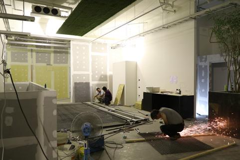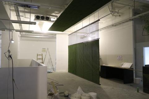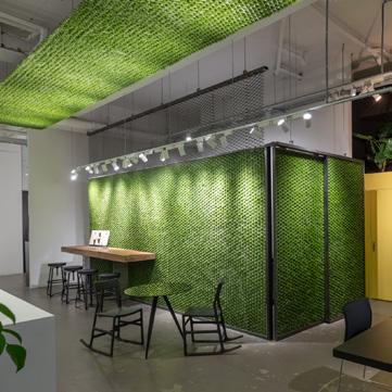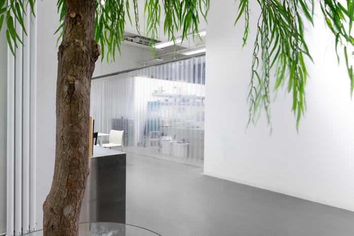 Continued the same language in the previous office of client, we created a central green box enclosing the staff kitchen and service areas to mark the communal core. The green enclosure is created by sandwiching turf between expanded metal sheets which are used as both structure and “frame” for the turf; a paper thin effect that loats the turf aloft. The loating turf, a large built-in planter box for real trees, clerestory shelves for artificial foliage and glass tables supported by real tree trunks together created a mixture of real and perceived green aura that surrounds this central space.