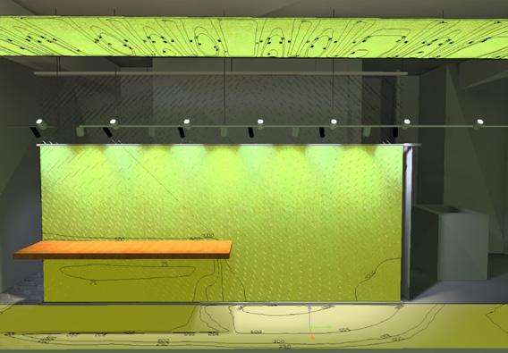 To standardise the lighting we use in this project and reused some light the client used to have, we chose the track light for all public area. When I tested the lighting effect on site at first, it was not efficiency and did not achieve what we expected. Therefore, I started to do the simulation by DIALux to balance the light on the expanded metal and grass. I tried to craeate more contrast for both on the wall and ceiling part. It helped me for not only on the result but also the basic knowledge about lighting and the software I can use.