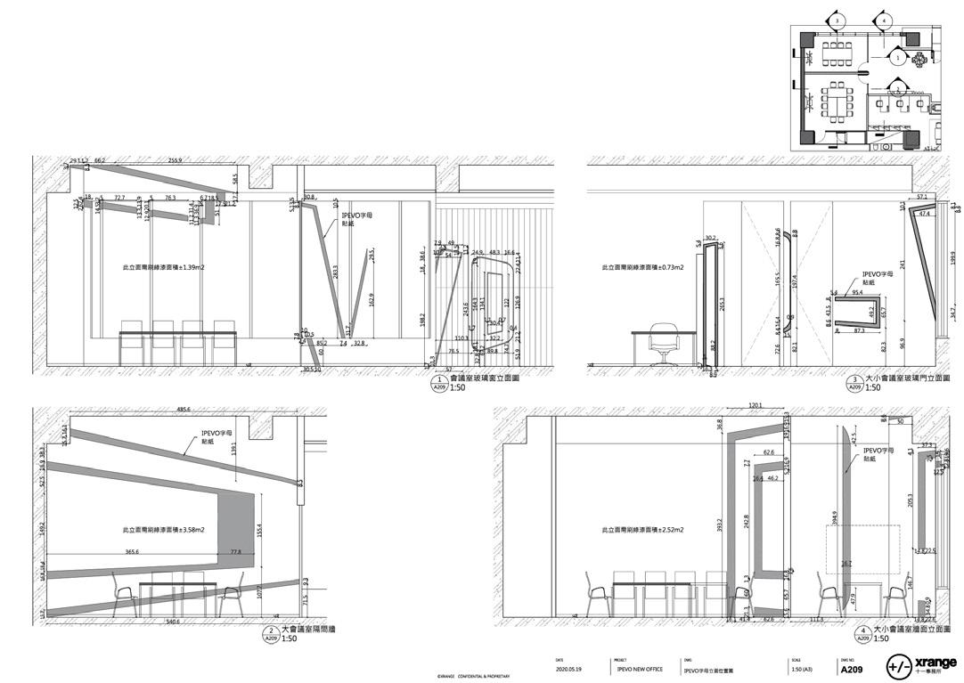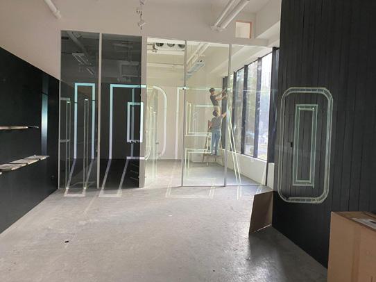 Combined with three different materials, paints, carpets and cutting sheets, the corporate logo is fragmented and dispersed onto windows, doors and walls of conference rooms at the far end of the space, its entirety only visible from one specific spot at the reception desk. I made a 3D model layout for the test and for the contractor, While it is diffecult to guarantee the accuracy. In the end, we spent a whole day laid out ourselves with tapes by projecting the logo onto the surface, and made sure the right coordination between three different contractors.